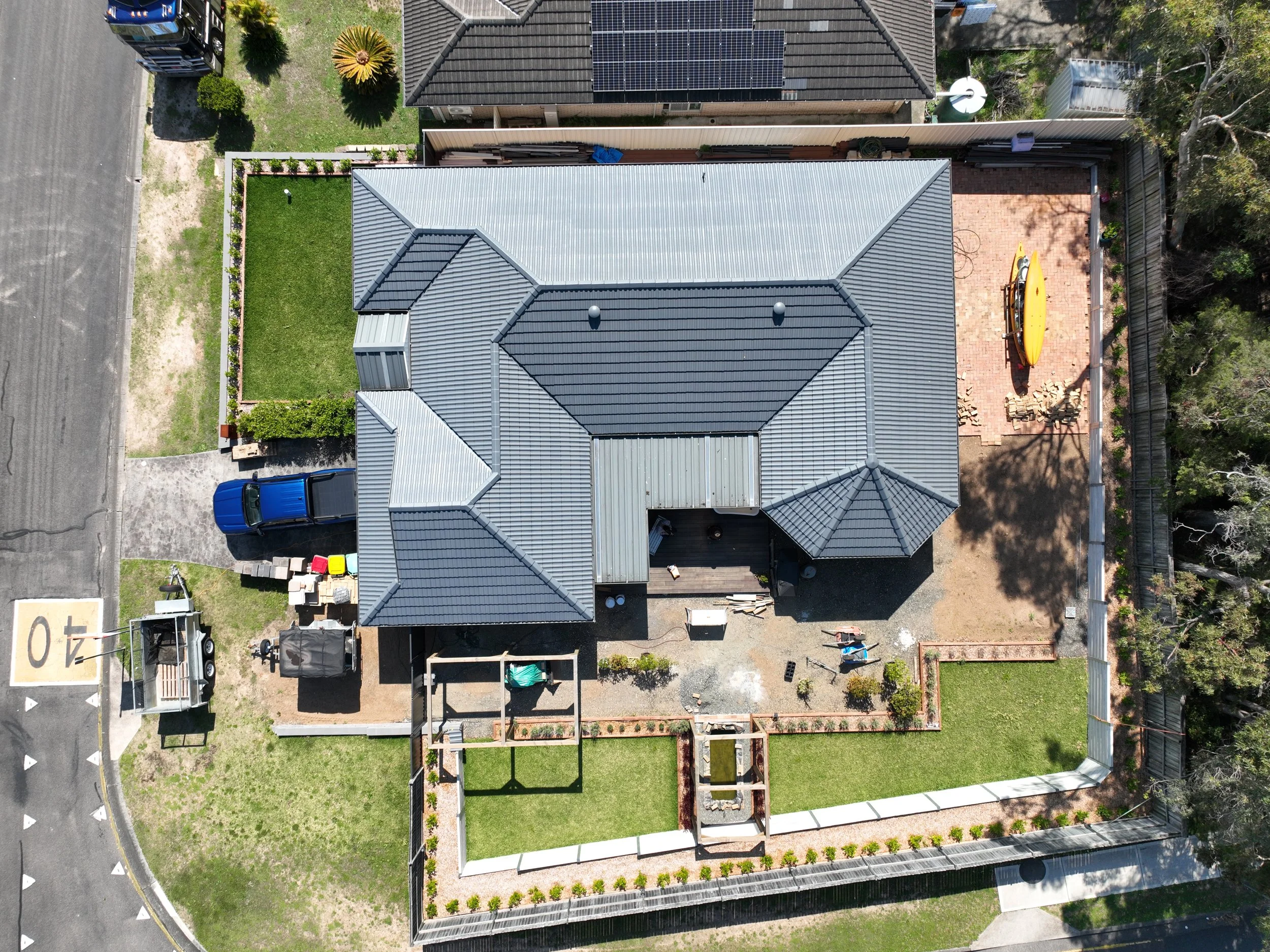 The San Remo house, located on the NSW Central Coast, underwent a full interior and exterior renovation to transform it into the ultimate beachside weekender. The original home, with its worn carpet, damaged floors, yellow and black walls, and impractical layout, was no longer fit for its intended purpose. The interiors were stripped back to the bare concrete and redesigned with warm timbers, featuring a modern kitchen with a striking 4m island that spans the home's depth, replacing the outdated front room. As the home is primarily for weekend relaxation and entertaining, the kitchen was designed to be the heart of the space. Exterior renovations involved excavating the steep backyard terrain to create a functional, low-maintenance area for outdoor enjoyment. While work is still ongoing, key features such as retaining walls, new turf, garden beds, a pergola, and a water feature have been completed. The final transformation of the backyard will complete this stunning beachside retreat—watch this space for the exciting finish!